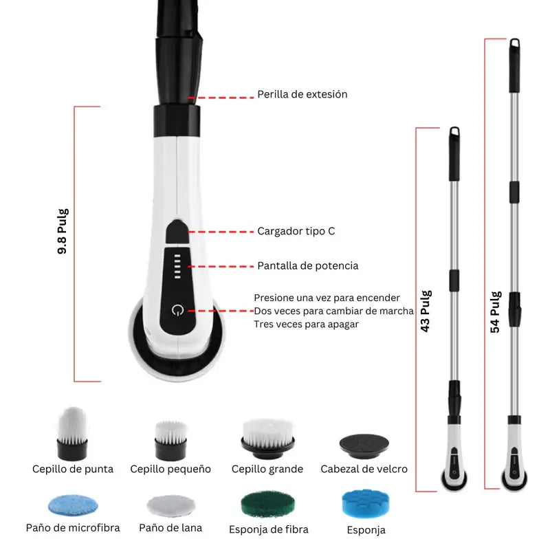 Este potente cepillo eléctrico giratorio está diseñado para hacer tu vida más fácil. Con tres velocidades ajustables (hasta 450RPM) y un sistema de rotación 360°, elimina la suciedad más difícil sin que tú muevas un dedo de más.