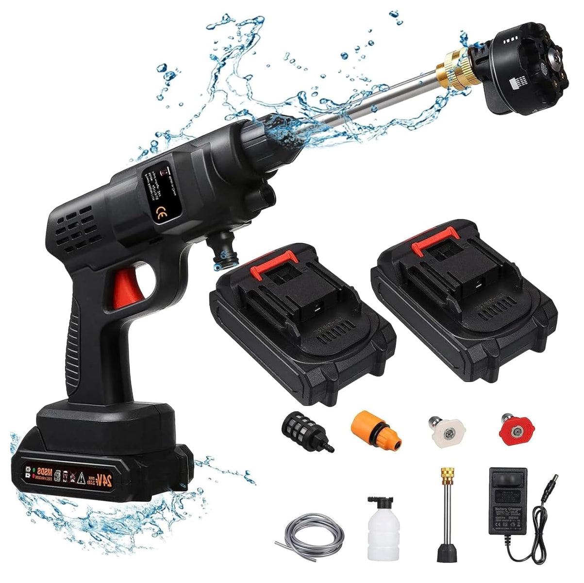 Incluye pistola, baterías, cargador, boquillas, barra de extensión, maceta de espuma, filtro y manguera.